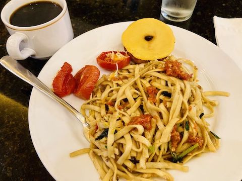 We finished our busy day back at Aston Jember, in their poolside bar, Planet Kopi. Even though the bar is open-walled, and the weather still hot & humid, Planet Kopi was pleasantly cooler. We ate there every night, getting to be friends with the chef, who one day made us a special batch of klepon. (A bright green desert made from pandan & glutinous rice flour, coated in grated coconut, filled with palm sugar.)